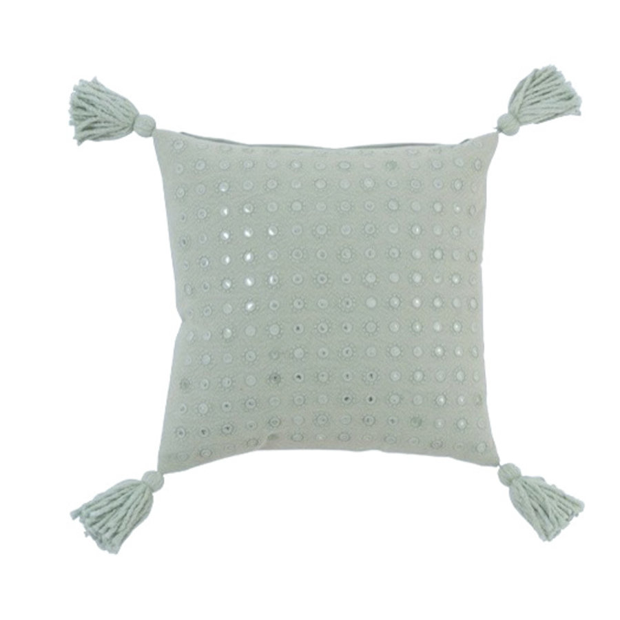 Dit leuke frisse kussen mag gezien worden. Een frisse tint blauw groen en de spiegeltjes maken dit mooie kussen echt een blikvanger.
