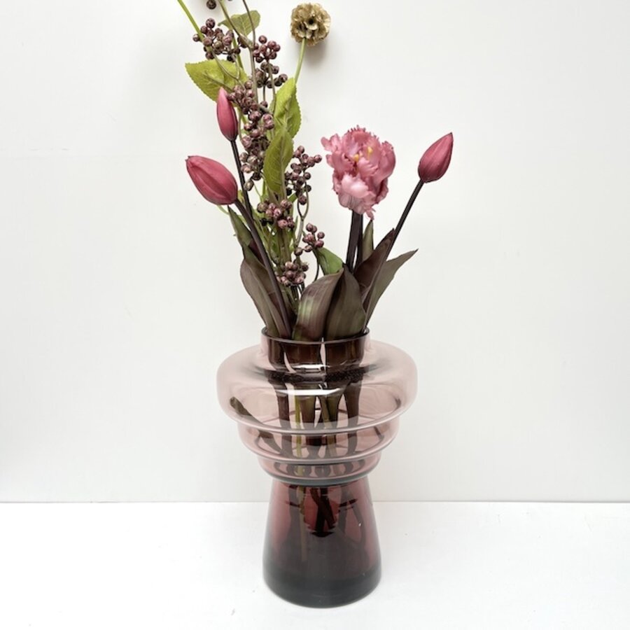 Deze bloemenvaas van oud roze glas is wel een echte blikvanger. Een prachtige vorm met fraai glazen patroon maakt deze grote vaas net even anders dan anders. Ideale glazen vaas voor een mooi groot boeket.