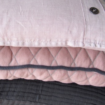 Mix en match: gebreide kussens met linnen kussens. Een rond kussen met een langwerpig kussen.