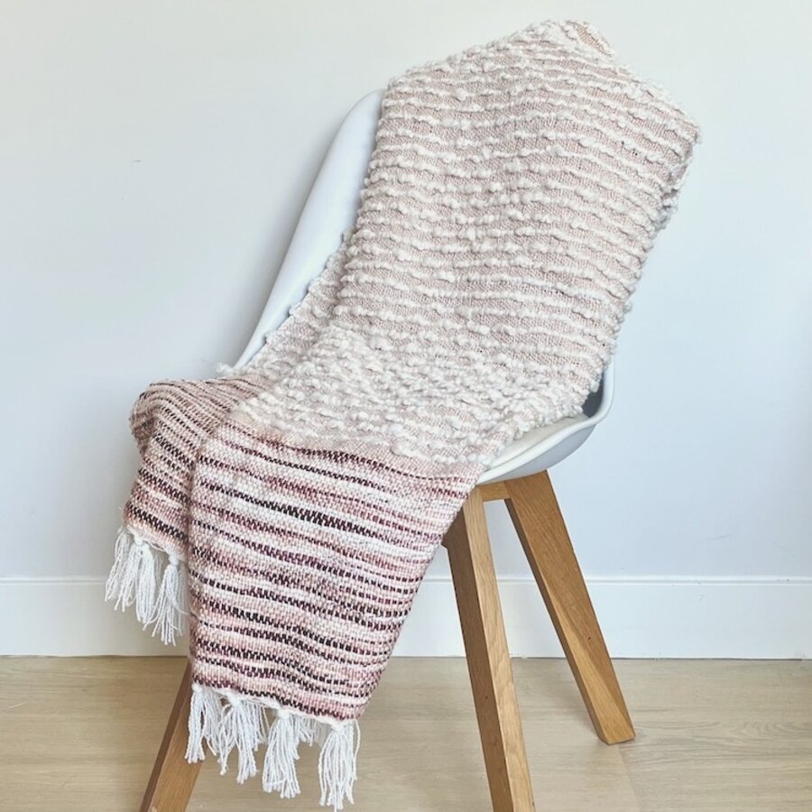 Dit frisse oud roze met wit gebreid plaid met leuk patroon mag je niet laten liggen. Door zijn verschillende tinten kun je hem makkelijk combineren. Wie laat deze frisse woondeken nu liggen?!