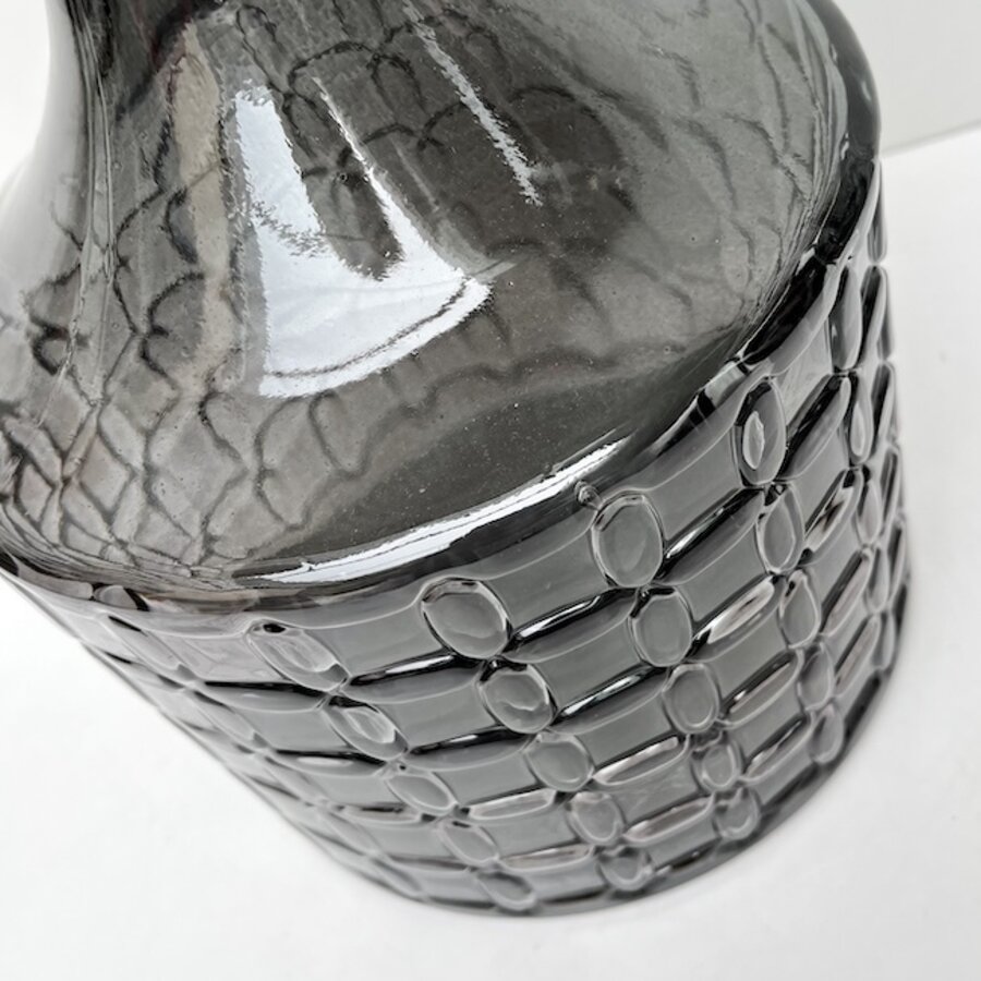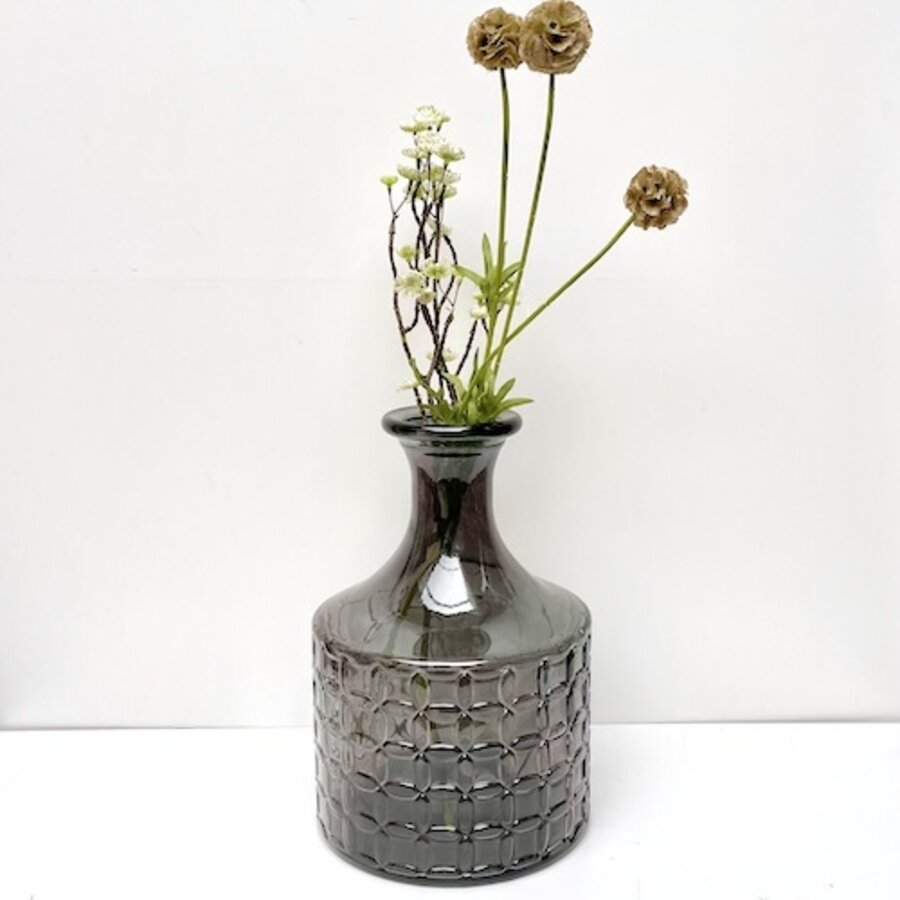 Mooie glazen vaas van Mrs Bloom met leuk patroon. Deze blauw grijze glazen fles is zowel met als zonder bloemen een plaatje!