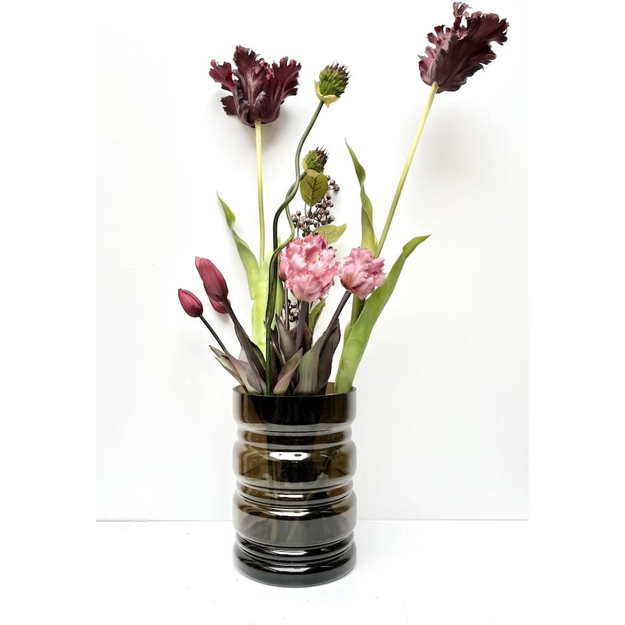 Deze elegante glazen vaas is werkelijk prachtig. Mrs Bloom heeft haar werk weer goed gedaan! Deze bloemenvaas valt op door zijn leuke vorm en het mooie grijs bruine glas. Een echte blikvanger die leuk te combineren is met wat windlichtjes in dezelfde kleuren op een elegant dienblad. Zet er wat takken in of een paar grote bloemen en zet hem op een mooie plek in je woonkamer of slaapkamer. Een ding is zeker, je kunt hem niet laten staan.
