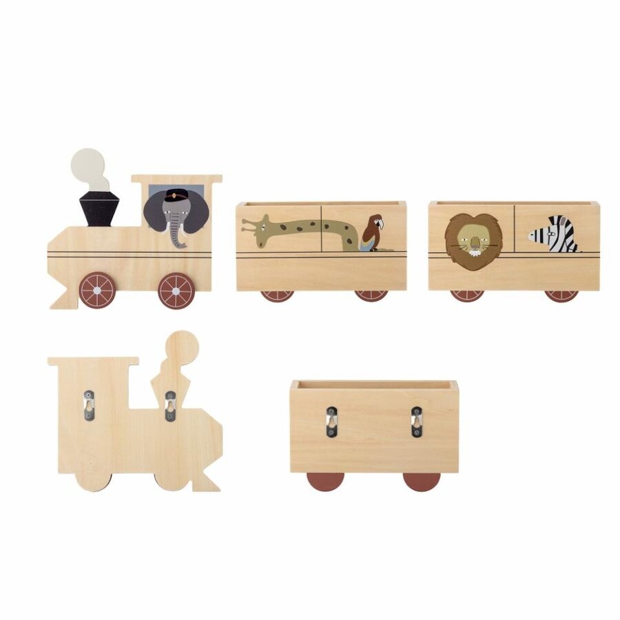 Houten kinderkamerdecoratie Mallen geeft met een vrolijke noot aan je kinderkamer. Het zijn handige opbergbakjes voor boekjes en ander klein speelgoed in de vorm van wagonnetjes en een treintje met leuke beestenboel. Combineer deze leuke houten wanddecoratie met andere dieren of circus items uit de Bloomingville MINI collectie en je creëert een gezellige sfeer.