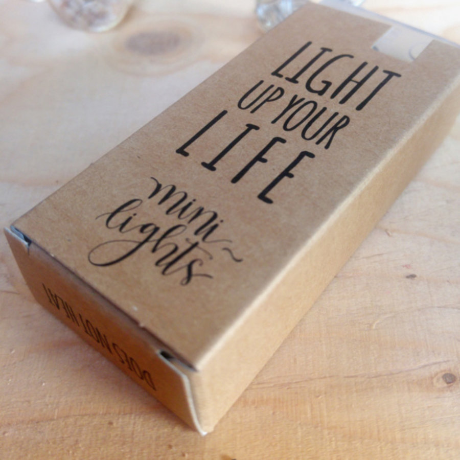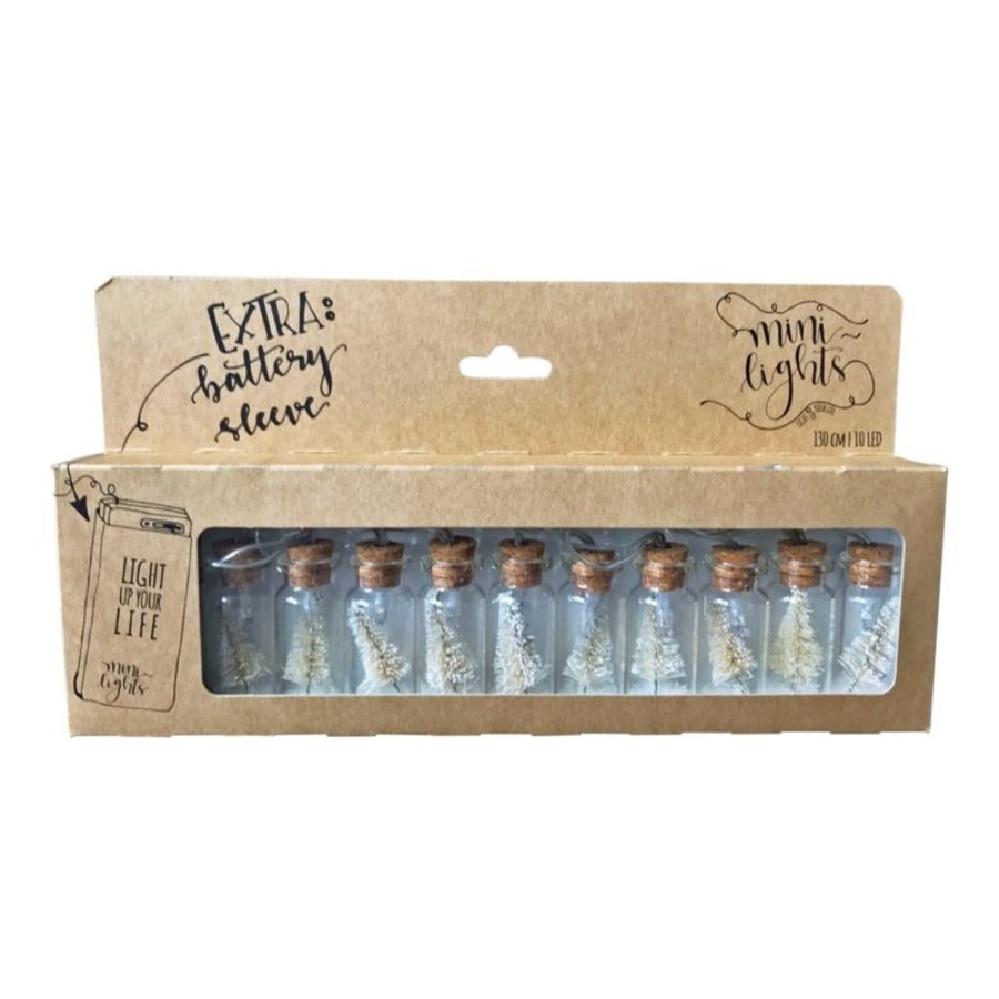 Mini-lights lichtsnoer met gevulde flesjes. Dit leuke lichtsnoer is altijd wel op zijn plaats als je sfeer zoekt. Het snoer is 1,80 mtr lang en heeft 10 glazen flesjes gevuld met witte kerstbomen. De LEDverlichting werkt op batterijen en heeft een leuk doosje om de batterijen heen zodat het een mooi geheel is. Leg dit leuke lichtsnoer op een feestelijk gedekte tafel, op je schouw of doe ze leuk in een grote glazen fles. Gezellig!