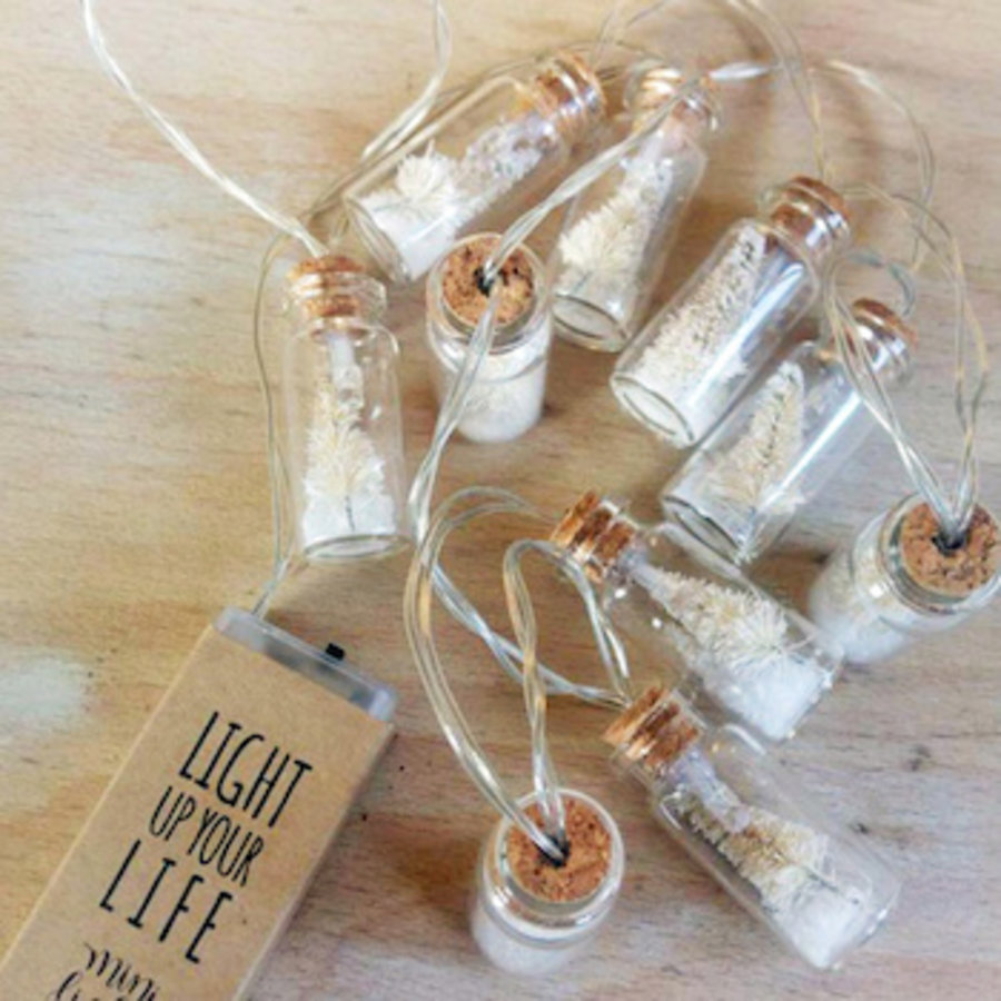 Leuk lichtsnoer met flesjes met witte kerstbomen erin. Deze toffe lichtslinger laat je toch hangen?!