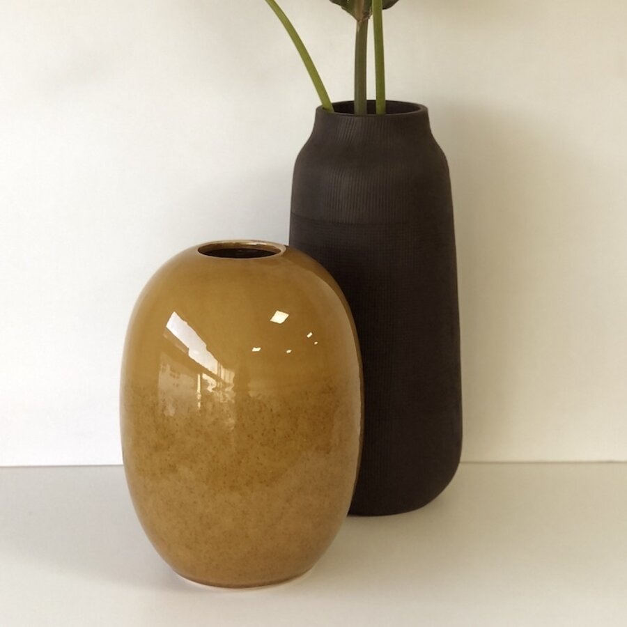 Okergele vaas in fraaie ronde vorm. Deze mooie bloemenvaas van Light & Living mag gezien worden.