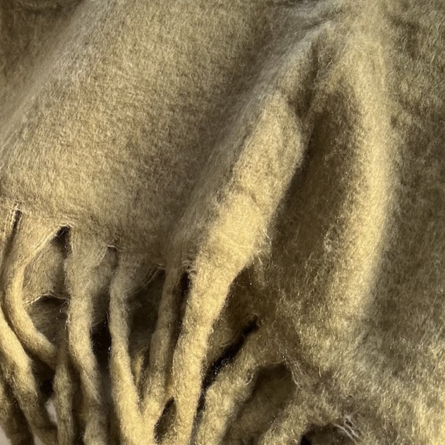 Heerlijk zacht wollen plaid in Olive green kleur met leuke franjes om zo onder te kruipen. Deze heerlijke wollen woonplaid is goed te combineren heel veel andere tinten in je interieur. Top plaid.