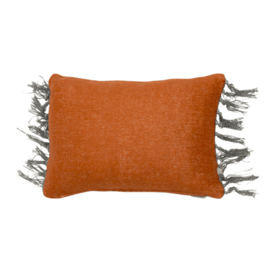 Leuk Lime Light kussen in oranje en grijs. Dit oranje kussen met franjes mag gezien worden.