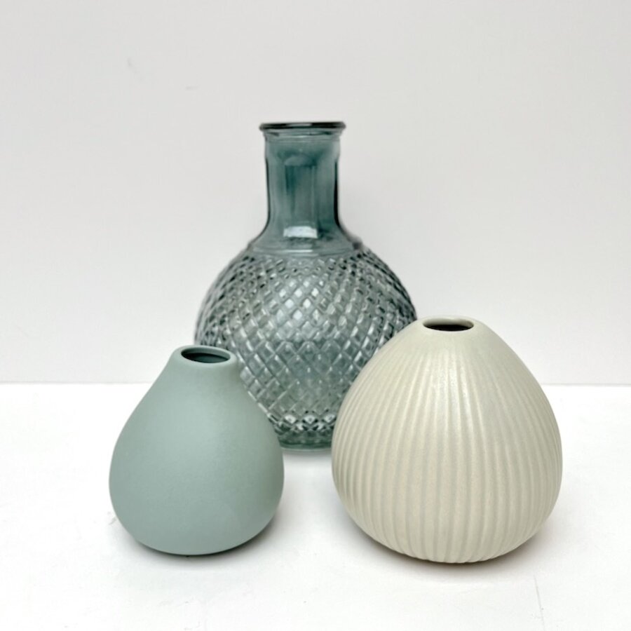 Deze mooie vazen in leuke vormen wil je niet missen. De glazen vaas met ruitjespatroon heeft een mooie blauw groene tint. Deze komt prachtig samen met het blauw groene keramieke vaasje met grappige vorm. Als frisse touch is het lichte oud groene vaasjes met strepenpatroon er bij gezet. Ton-sur-ton en werkelijk mooi!